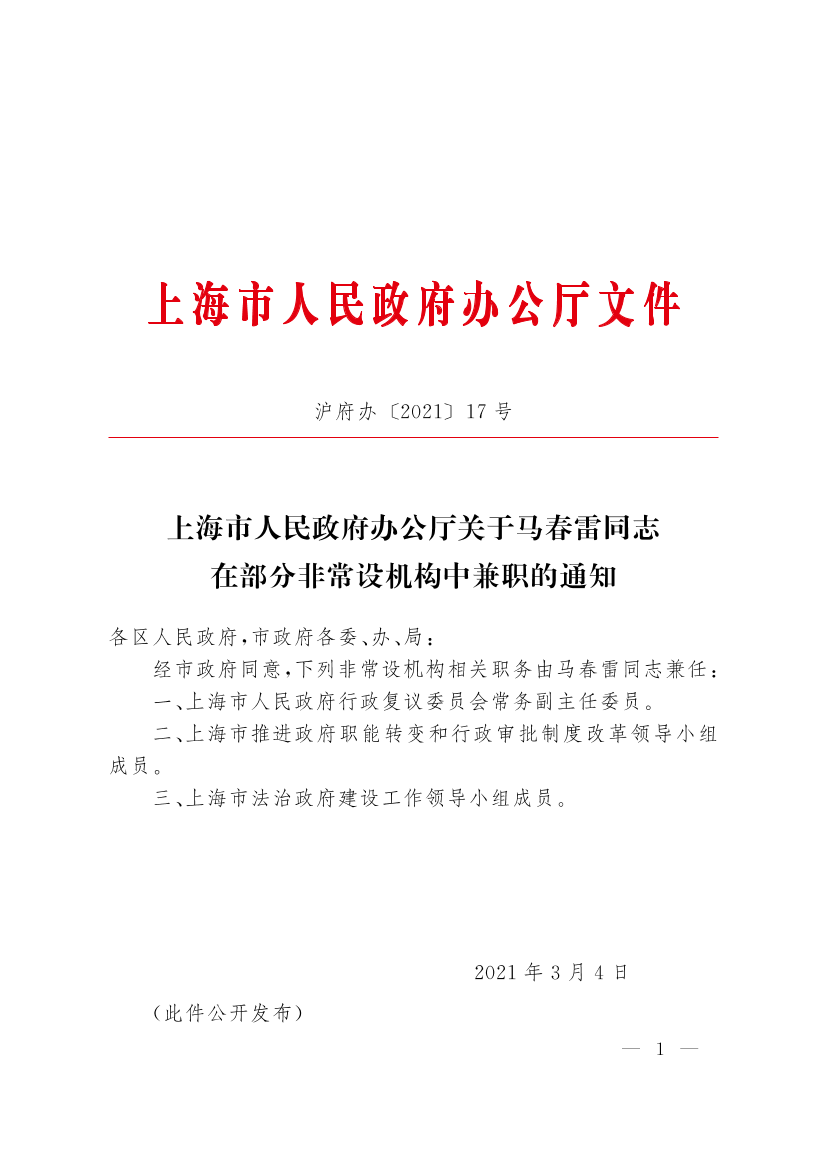 上海市人民政府办公厅关于马春雷同志在部分非常设机构中兼职的通知