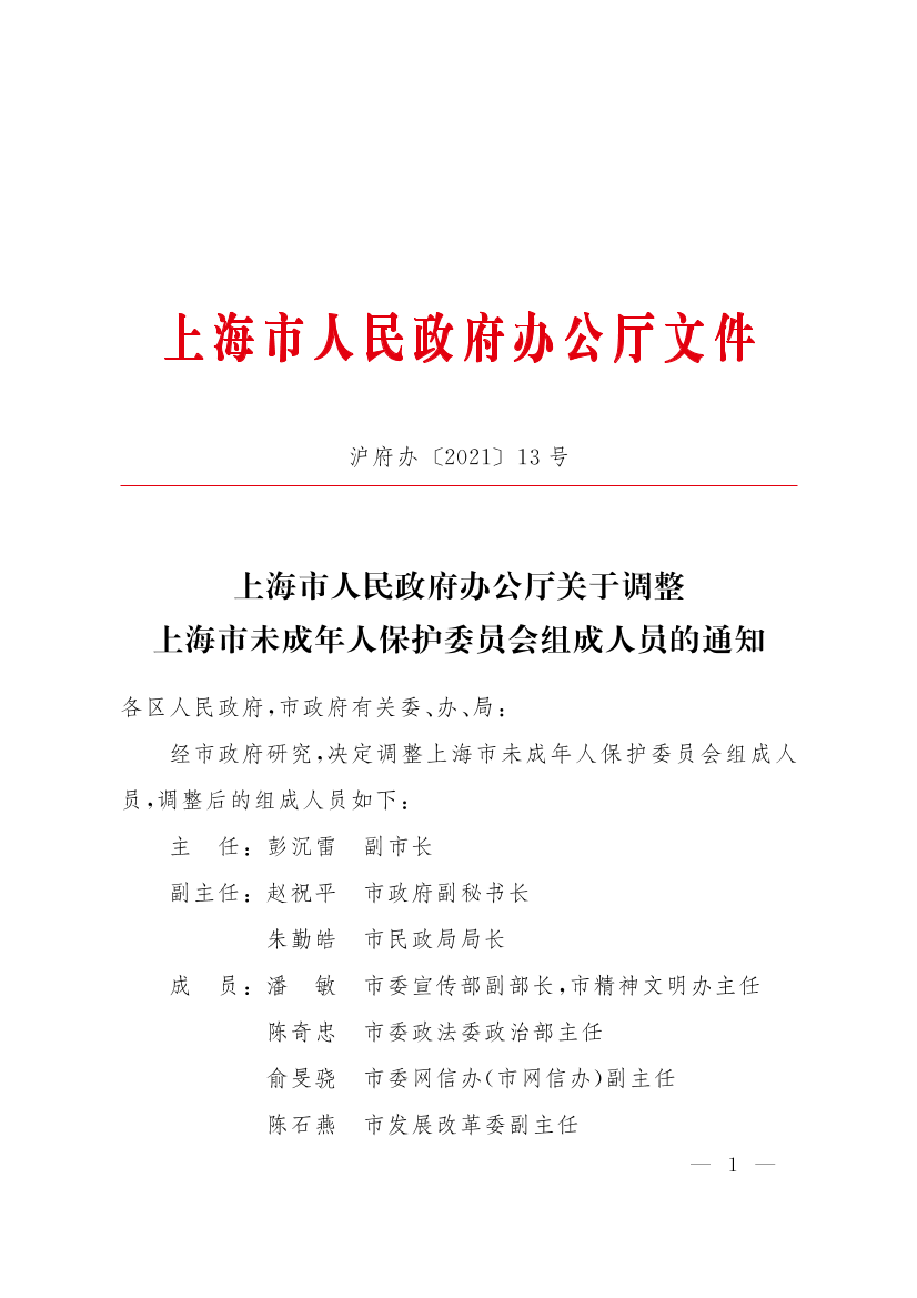 经市政府研究,决定调整上海市未成年人保护委员会组成人员,调整后的组成人员如下: