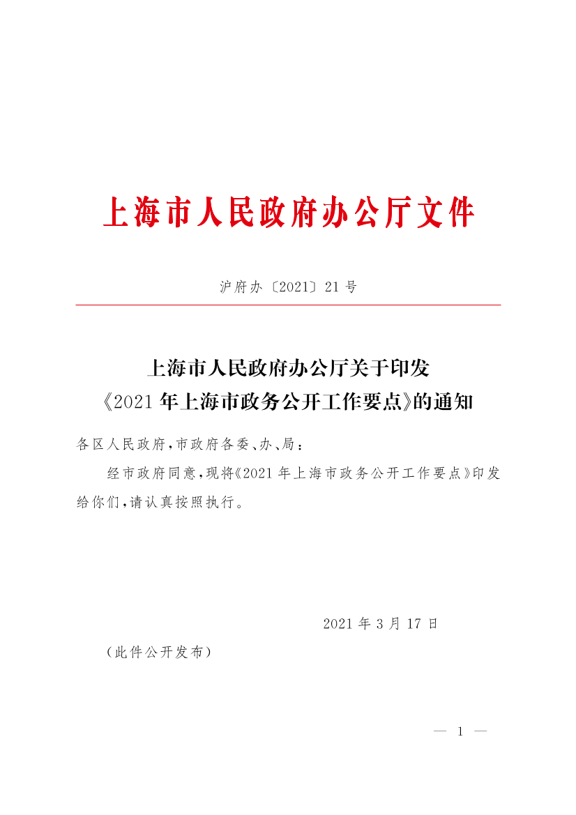 上海市人民政府办公厅关于印发《2021年上海市政务公开工作要点》的通知