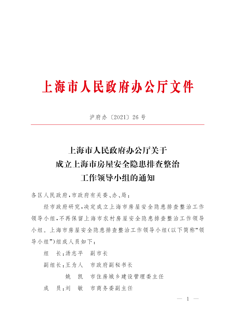 经市政府研究,决定成立上海市房屋安全隐患排查整治工作领导小组,不再保留上海市农村房屋安全隐患排查整治工作领导小组。上海市房屋安全隐患排查整治工作领导小组(以下简称“领导小组”)组成人员如下:
