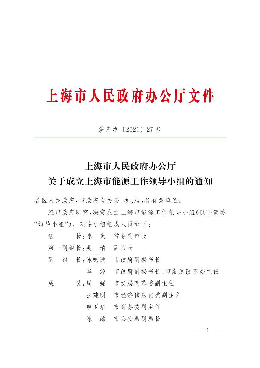 上海市人民政府办公厅关于成立上海市能源工作领导小组的通知