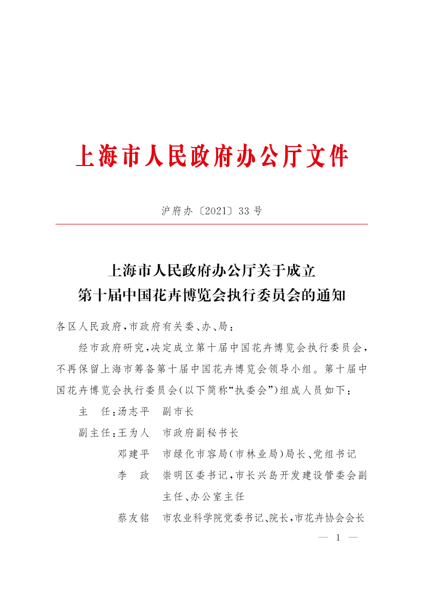 经市政府研究,决定成立第十届中国花卉博览会执行委员会,不再保留上海市筹备第十届中国花卉博览会领导小组。第十届中国花卉博览会执行委员会(以下简称“执委会”)组成人员如下: