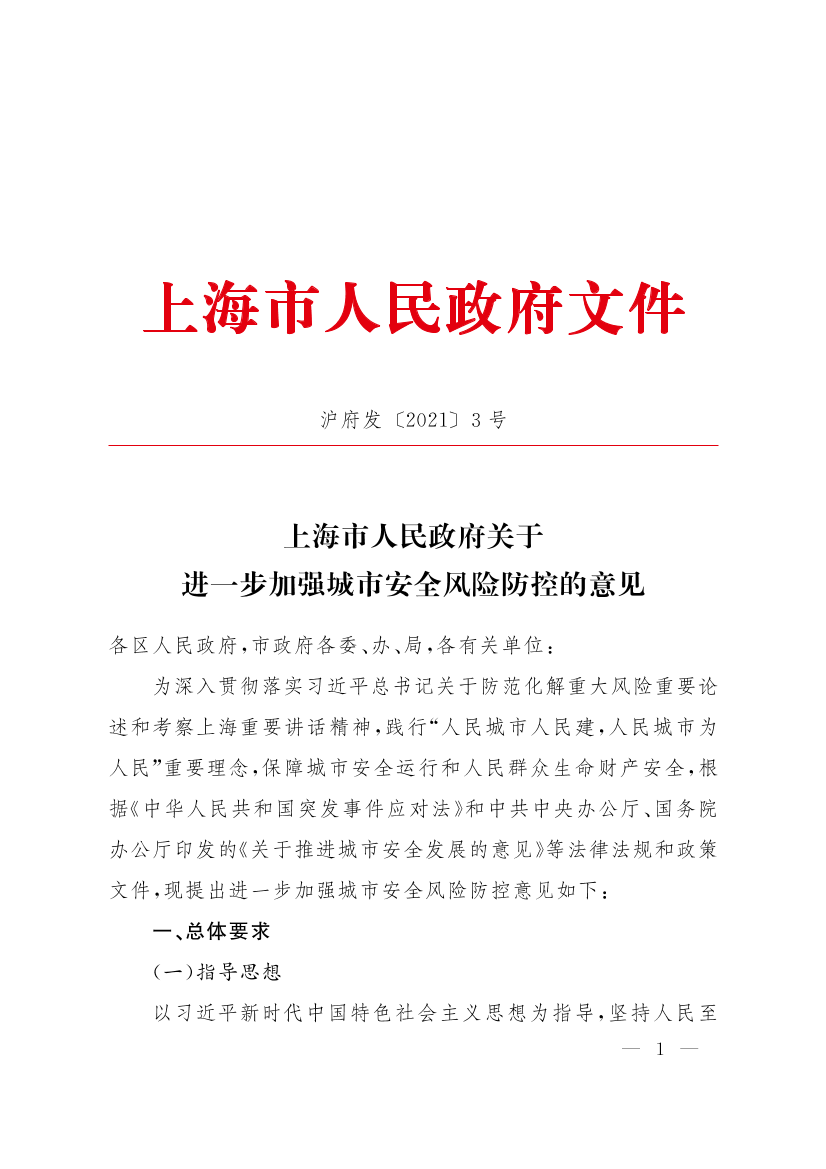 上海市人民政府关于进一步加强城市安全风险防控的意见
