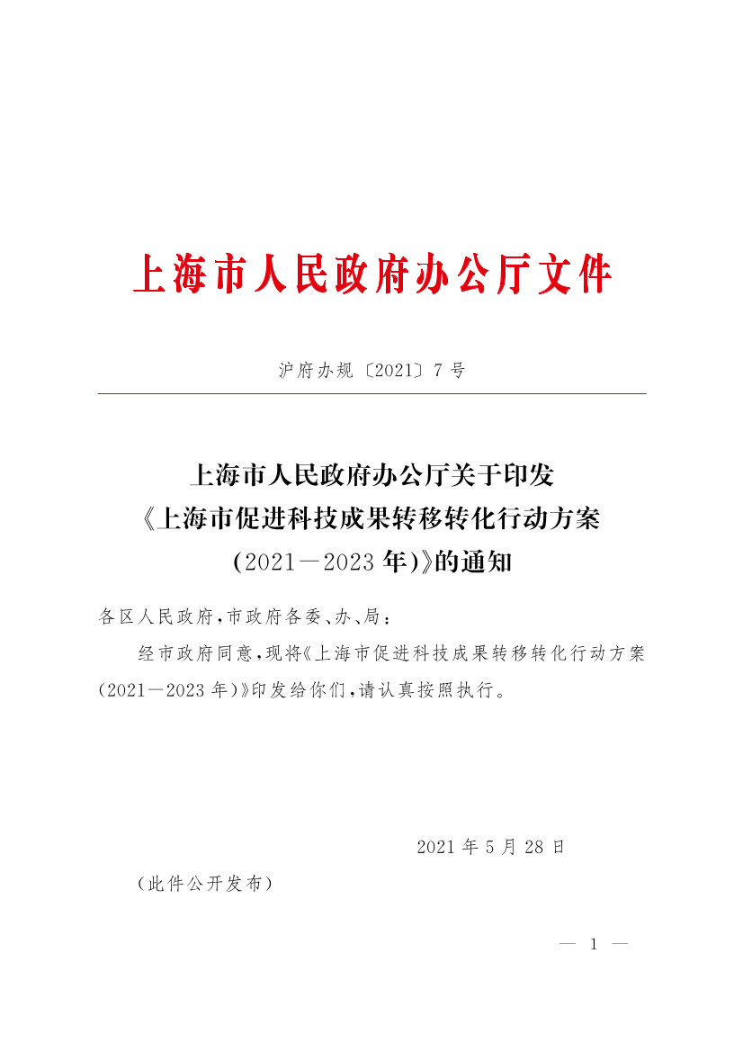 上海市人民政府办公厅关于印发《上海市促进科技成果转移转化行动方案(2021-2023年)》的通知