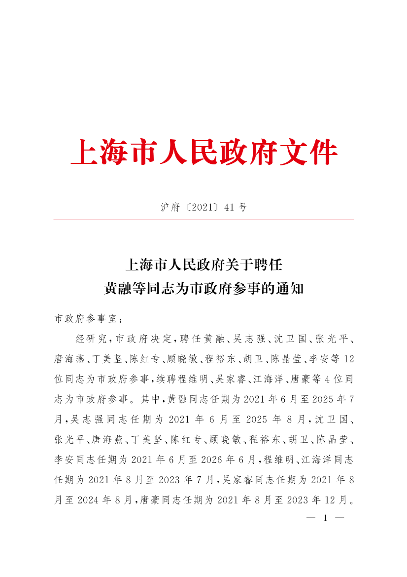 经研究,市政府决定,聘任黄融、吴志强、沈卫国、张光平、唐海燕、丁美坚、陈红专、顾晓敏、程裕东、胡卫、陈晶莹、李安等12位同志为市政府参事,续聘程维明、吴家睿、江海洋、唐豪等4位同志为市政府参事。其中,黄融同志任期为2021年6月至2025年7月,吴志强同志任期为2021年6月至2025年8月,沈卫国、张光平、唐海燕、丁美坚、陈红专、顾晓敏、程裕东、胡卫、陈晶莹、李安同志任期为2021年6月至2026年6月,程维明、江海洋同志任期为2021年8月至2023年7月,吴家睿同志任期为2021年8月至2024年8月,唐豪同志任期为2021年8月至2023年12月。