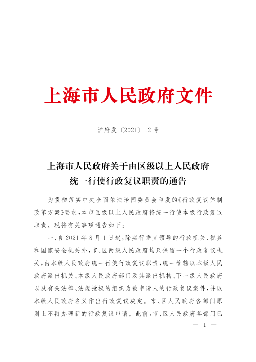 一、自2021年8月1日起,除实行垂直领导的行政机关、税务和国家安全机关外,市、区两级人民政府均只保留一个行政复议机关,由本级人民政府统一行使行政复议职责,统一管辖以本级人民政府派出机关、本级人民政府部门及其派出机构、下一级人民政府以及有关法律、法规授权的组织为被申请人的行政复议案件,并以本级人民政府名义作出行政复议决定。市、区人民政府各部门原则上不再办理新的行政复议申请。此前,市、区人民政府各部门已经收到的行政复议申请,由该部门继续办理。