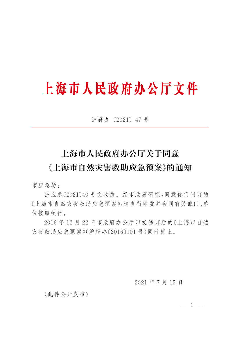 2016年12月22日市政府办公厅印发修订后的《上海市自然灾害救助应急预案》(沪府办〔2016〕101号)同时废止。