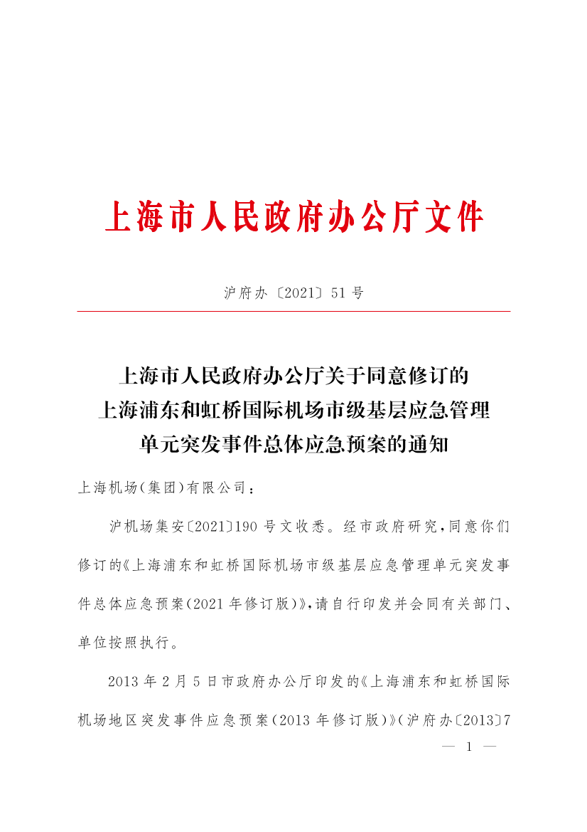 沪机场集安〔2021〕190号文收悉。经市政府研究,同意你们修订的《上海浦东和虹桥国际机场市级基层应急管理单元突发事件总体应急预案(2021年修订版)》,请自行印发并会同有关部门、单位按照执行。