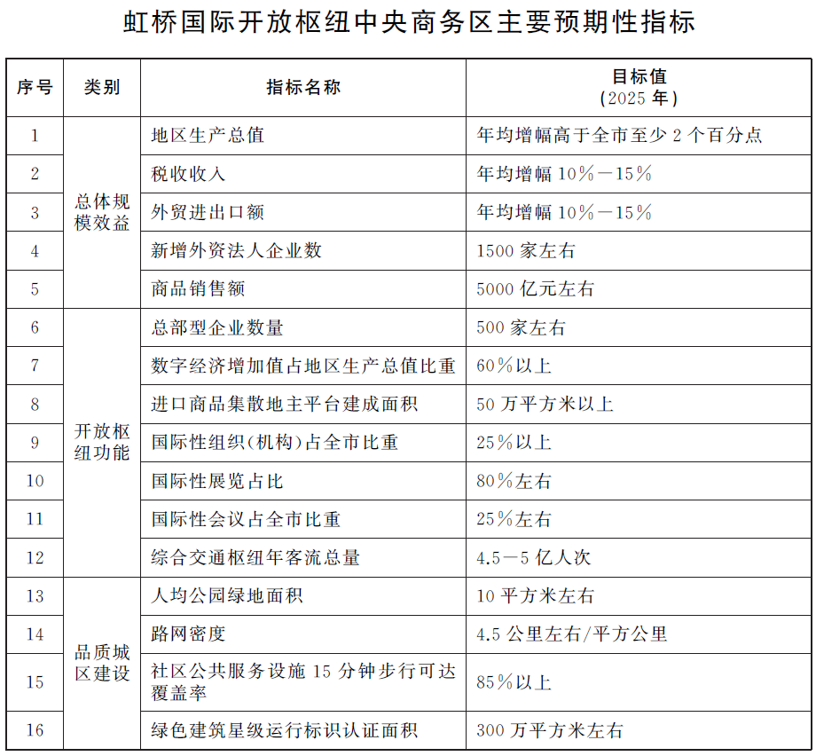 到2025年,基本建成虹桥国际开放枢纽核心承载区。在高能级主体集聚、现代产业经济集群初显、带动区域经济高质量发展的引领力增强、核心功能显著提升的基础上,中央商务区和国际贸易中心新平台功能框架和制度体系全面确立,综合交通枢纽管理水平显著提升,服务长三角和联通国际的作用进一步发挥。
