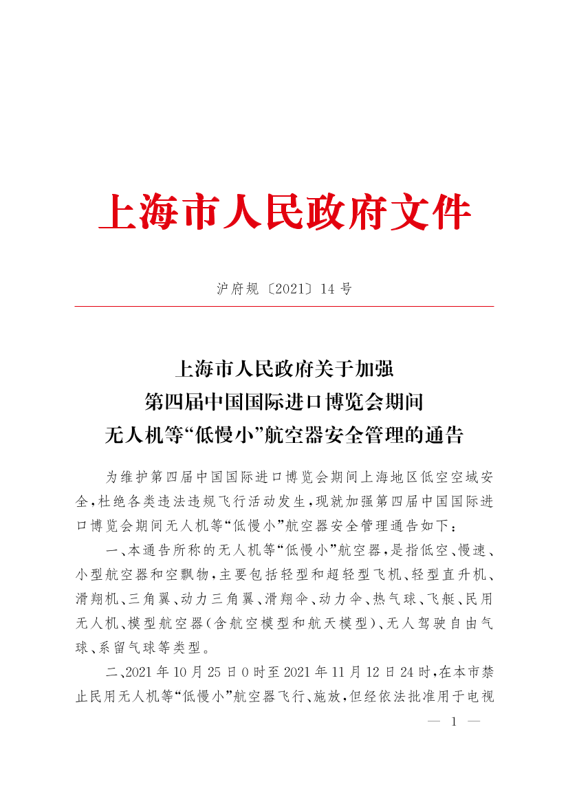 为维护第四届中国国际进口博览会期间上海地区低空空域安全,杜绝各类违法违规飞行活动发生,现就加强第四届中国国际进口博览会期间无人机等“低慢小”航空器安全管理通告如下: