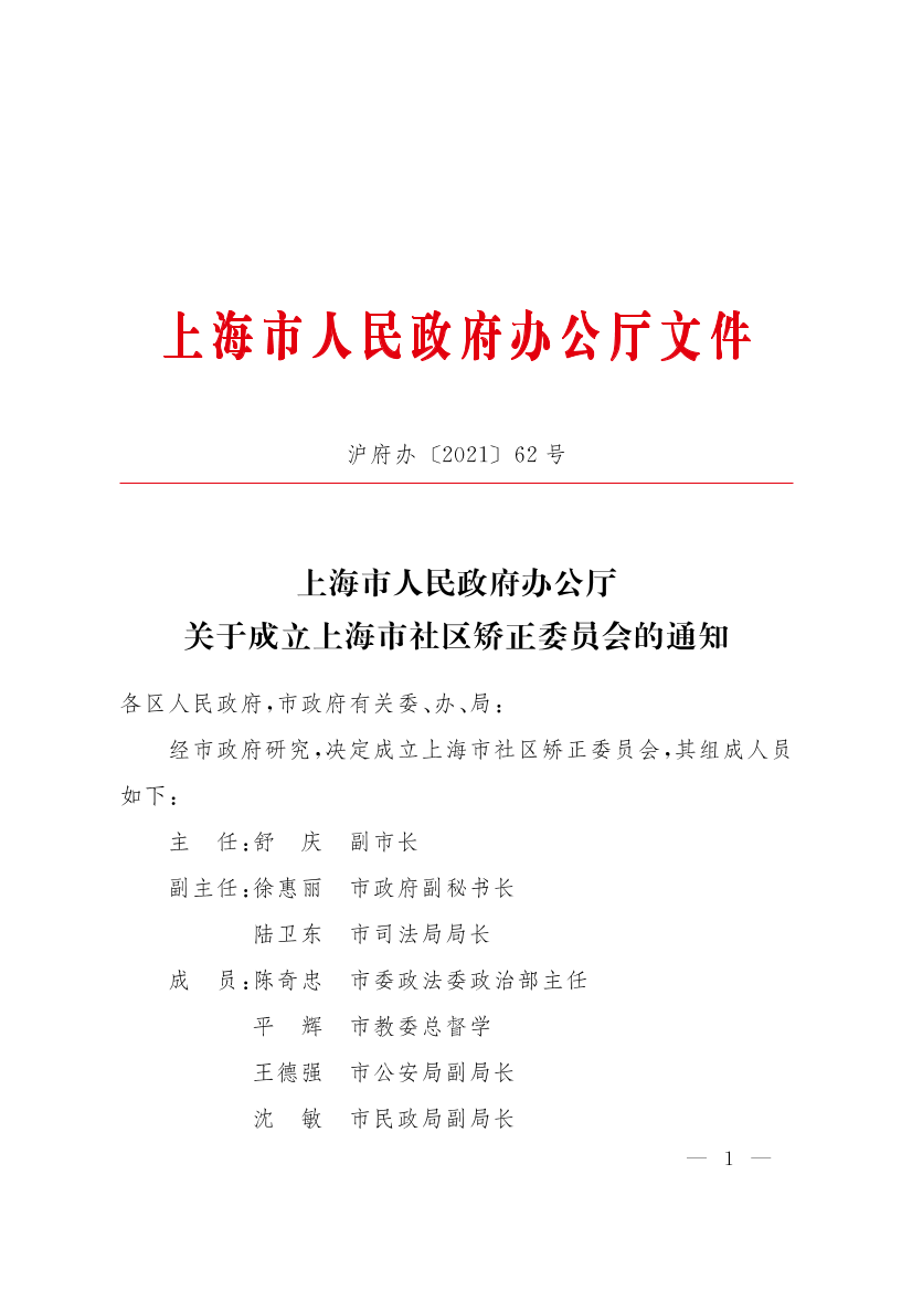上海市人民政府办公厅关于成立上海市社区矫正委员会的通知