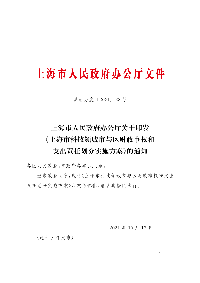 上海市科技领域市与区财政事权和支出责任划分实施方案