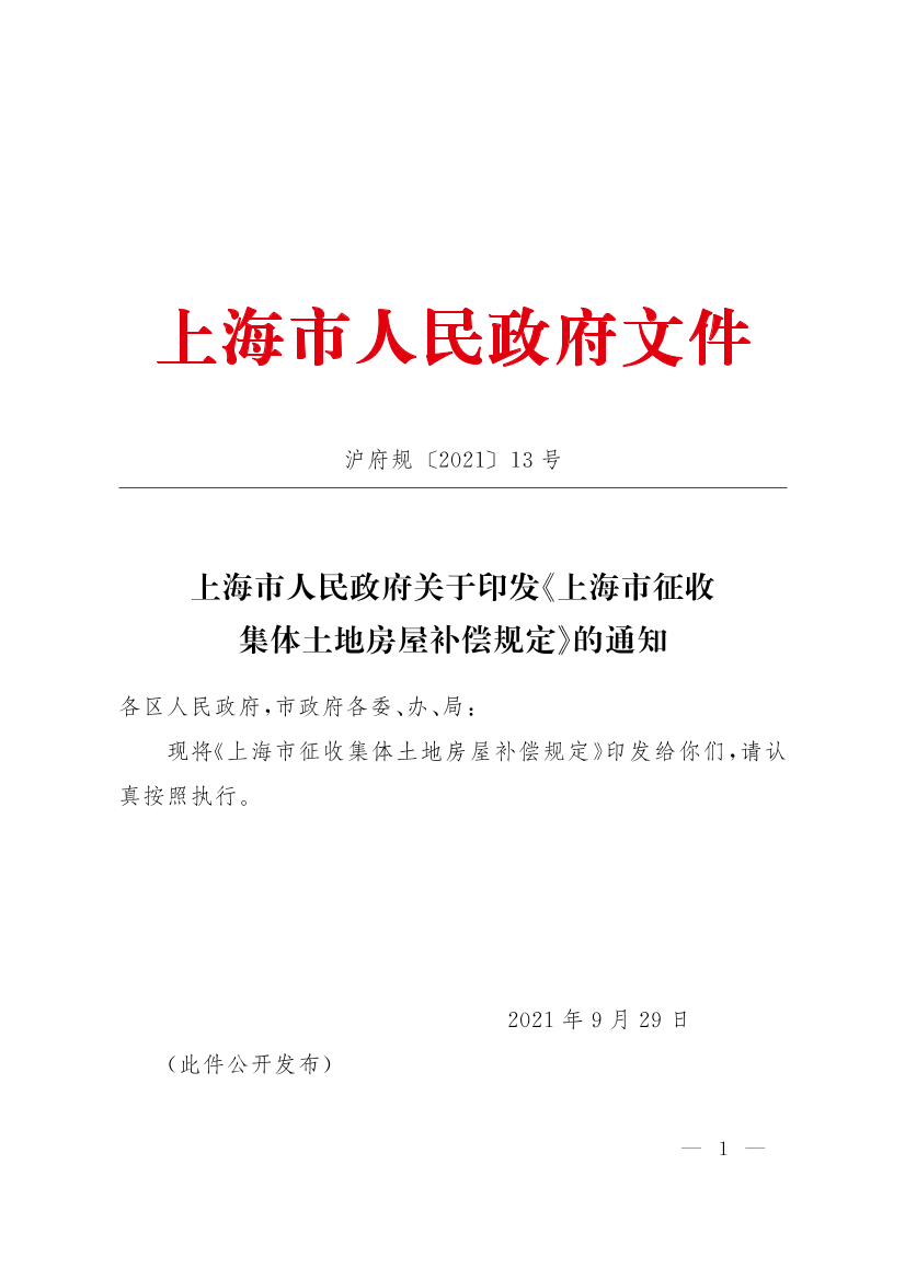上海市人民政府关于印发《上海市征收集体土地房屋补偿规定》的通知