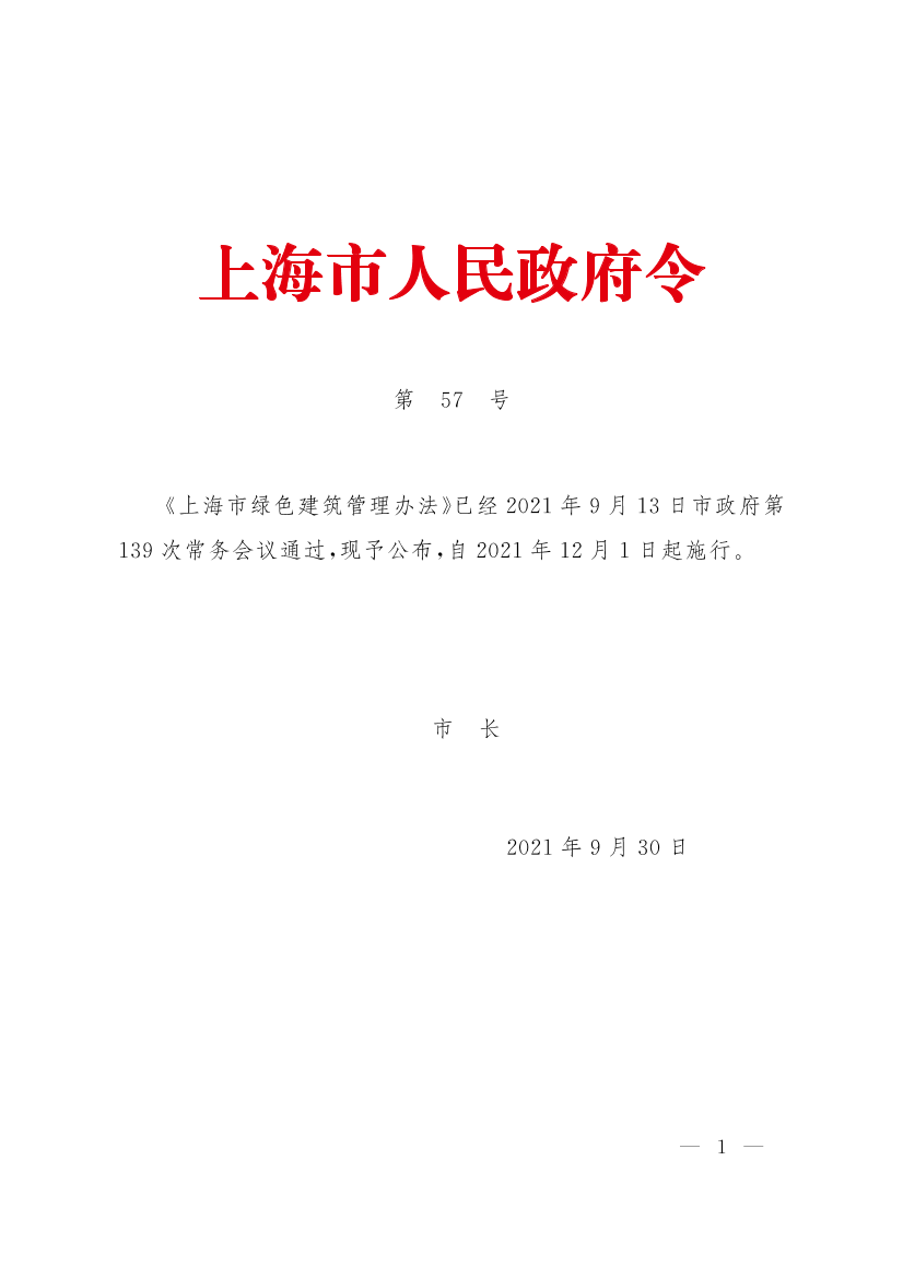 《上海市绿色建筑管理办法》已经2021年9月13日市政府第139次常务会议通过,现予公布,自2021年12月1日起施行。