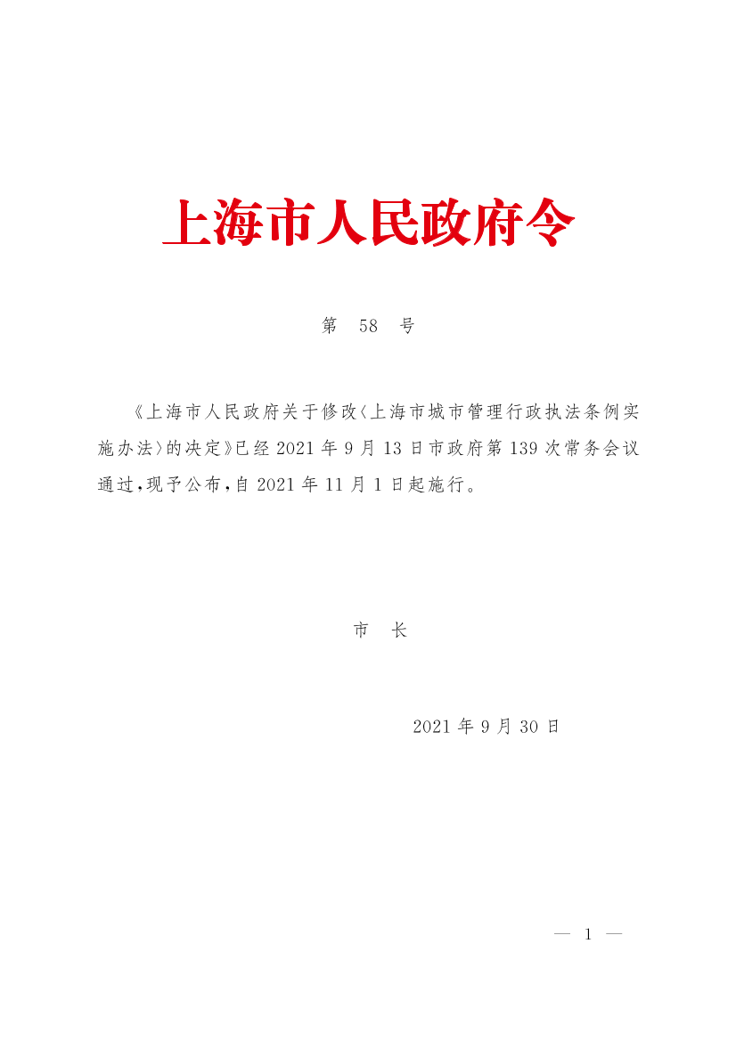 《上海市人民政府关于修改〈上海市城市管理行政执法条例实施办法〉的决定》已经2021年9月13日市政府第139次常务会议通过,现予公布,自2021年11月1日起施行。
