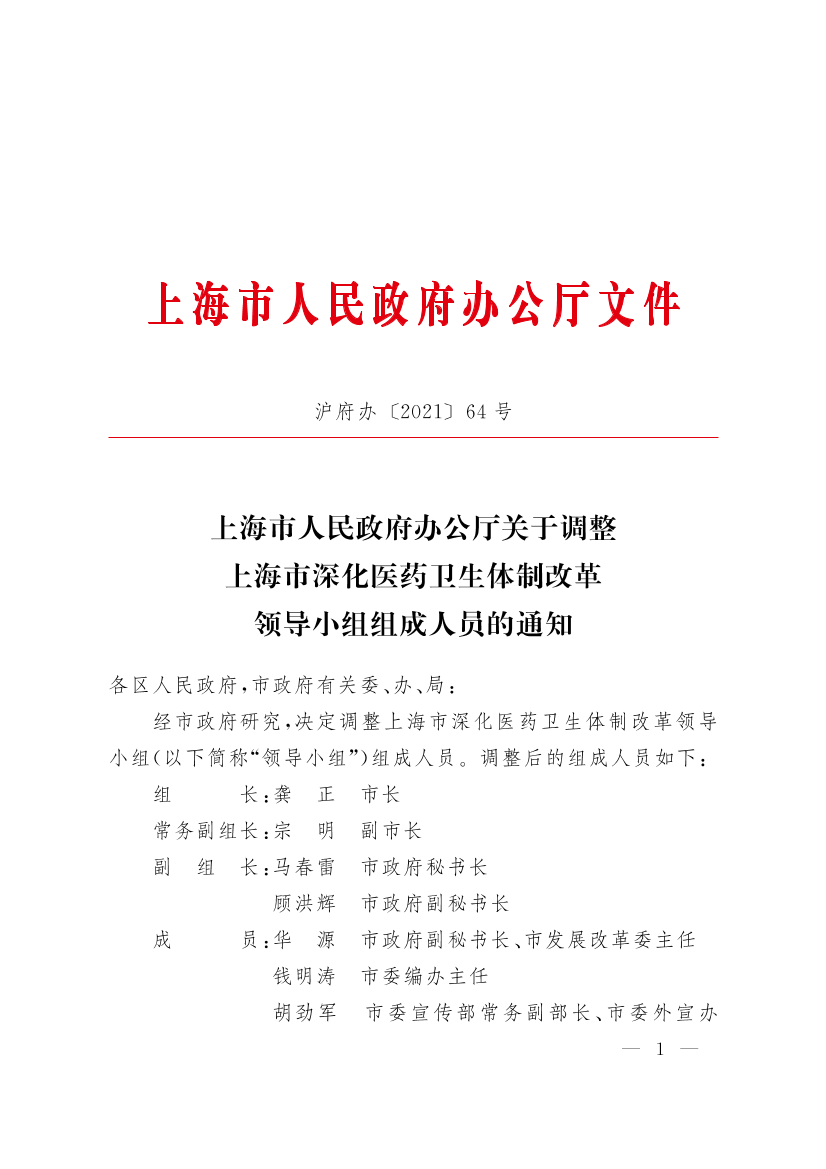 上海市人民政府办公厅关于调整上海市深化医药卫生体制改革领导小组组成人员的通知