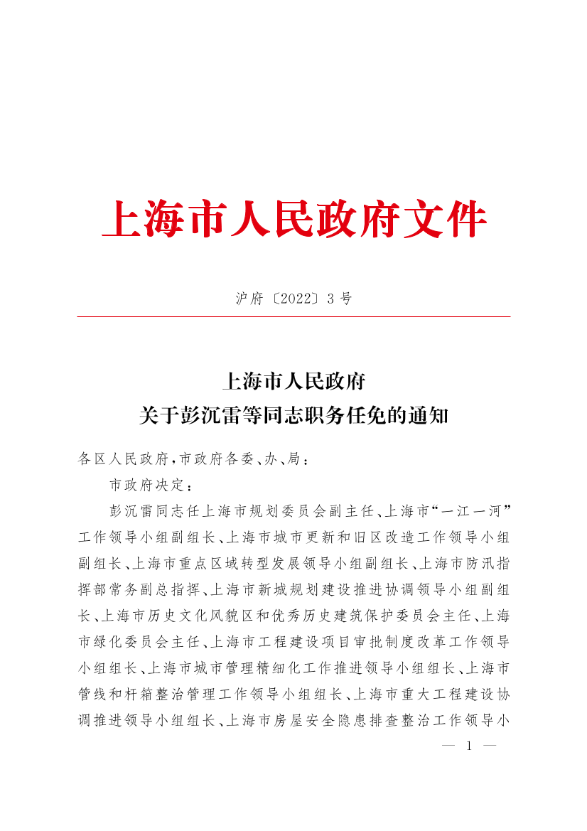 上海市人民政府关于彭沉雷等同志职务任免的通知