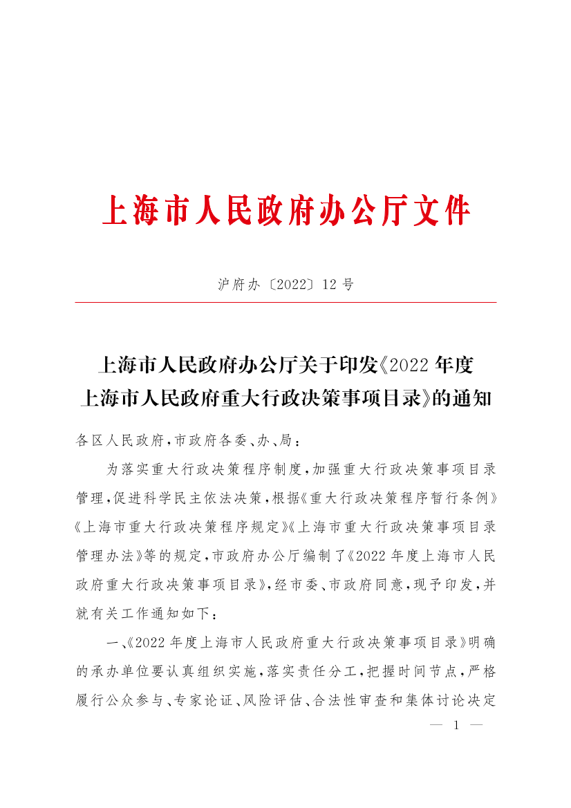 上海市人民政府办公厅关于印发《2022年度上海市人民政府重大行政决策事项目录》的通知