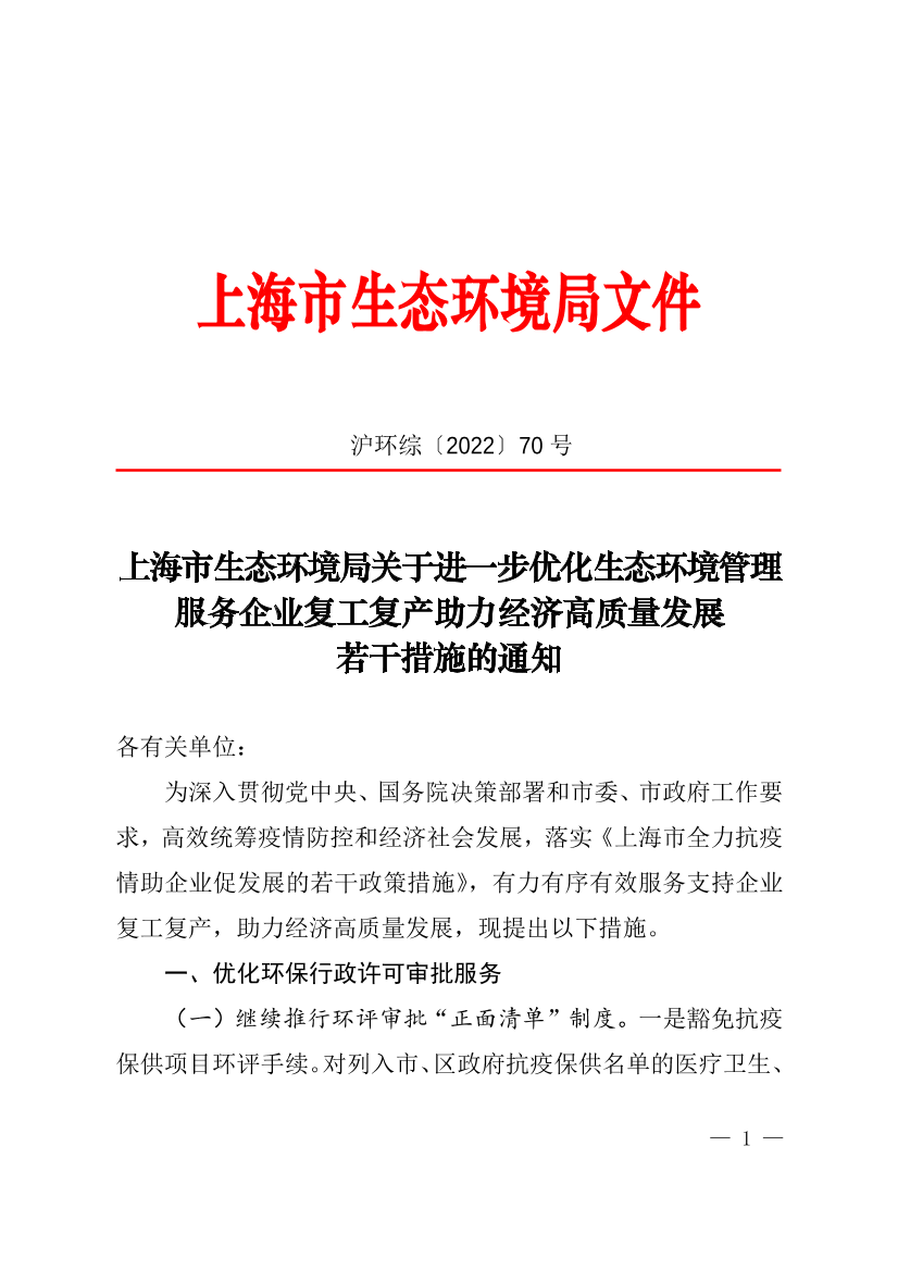 (一)继续推行环评审批“正面清单”制度。一是豁免抗疫保供项目环评手续。对列入市、区政府抗疫保供名单的医疗卫生、研究试验和物资生产等临时性建设项目的新改扩建,可免于办理环评审批或备案手续以及排污许可申领和变更手续。对疫情结束后仍需使用的上述临时性项目,可以实行告知承诺管理,或先开工后补办环评和排污许可手续。二是扩大环评告知承诺实施范围。扩大对医药制造业、研究和试验发展业、汽车制造业、交通运输业、农副食品加工业等行业的部分建设项目实施环评告知承诺的范围。扩大环评告知承诺的具体实施范围另行制定。