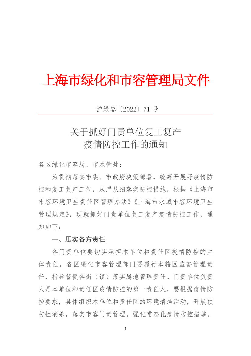 为贯彻落实市委、市政府决策部署,统筹开展好疫情防控和复工复产工作,从严从细落实防控措施,根据《上海市市容环境卫生责任区管理办法》《上海市水域市容环境卫生管理规定》,现就抓好门责单位复工复产疫情防控工作,通知如下: