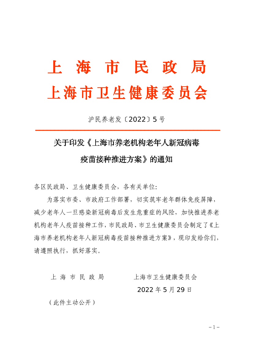 为落实市委、市政府工作部署,切实筑牢老年群体免疫屏障,减少老年人一旦感染新冠病毒后发生危重症的风险,加快推进养老机构老年人疫苗接种工作,市民政局、市卫生健康委员会制定了《上海市养老机构老年人新冠病毒疫苗接种推进方案》,现印发给你们,请遵照执行,抓好落实。
