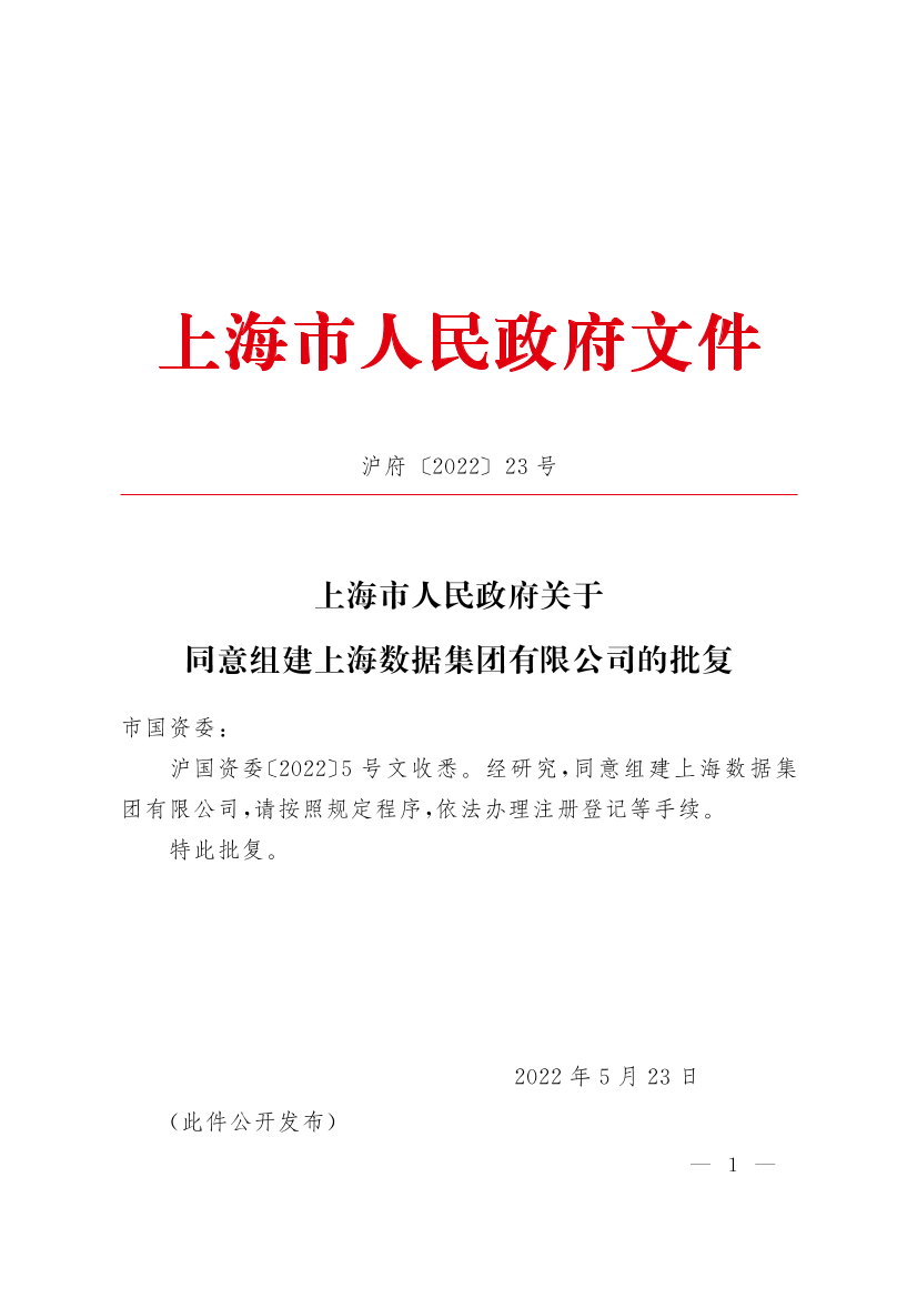 沪国资委〔2022〕5号文收悉。经研究,同意组建上海数据集团有限公司,请按照规定程序,依法办理注册登记等手续。