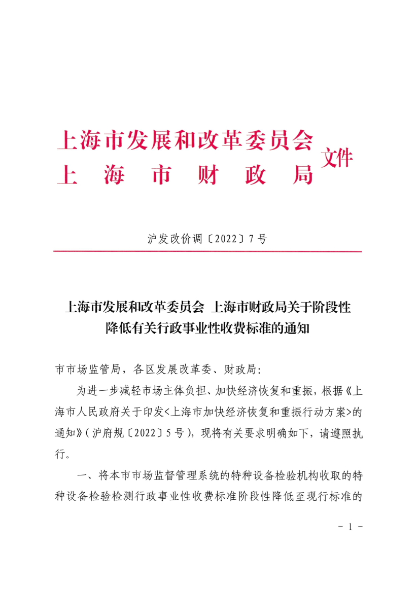 一、将本市市场监督管理系统的特种设备检验机构收取的特种设备检验检测行政事业性收费标准阶段性降低至现行标准的50%,收费项目范围等其他规定不变。鼓励其他特种设备检验机构结合实际参照执行。