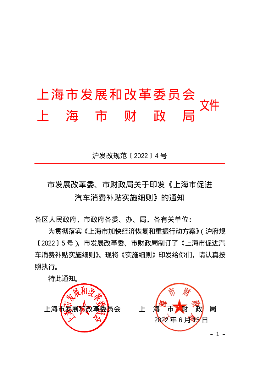 为贯彻落实《上海市加快经济恢复和重振行动方案》(沪府规〔2022〕5号),市发展改革委、市财政局制订了《上海市促进汽车消费补贴实施细则》。现将《实施细则》印发给你们,请认真按照执行。