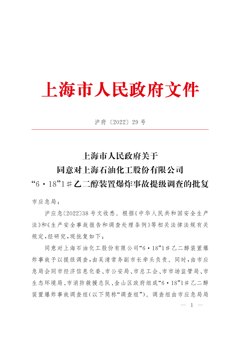 同意对上海石油化工股份有限公司“6·18”1#乙二醇装置爆炸事故予以提级调查,由吴清常务副市长牵头负责。同时,由市应急局会同市经济信息化委、市公安局、市总工会、市市场监管局、市生态环境局、市消防救援总队、金山区政府组成“6·18”1#乙二醇装置爆炸事故调查组(以下简称“调查组”)。调查组由市应急局局长马坚泓担任组长、市应急局副局长杨晓东担任副组长。