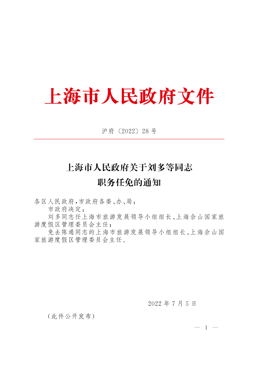 刘多同志任上海市旅游发展领导小组组长、上海佘山国家旅游度假区管理委员会主任;