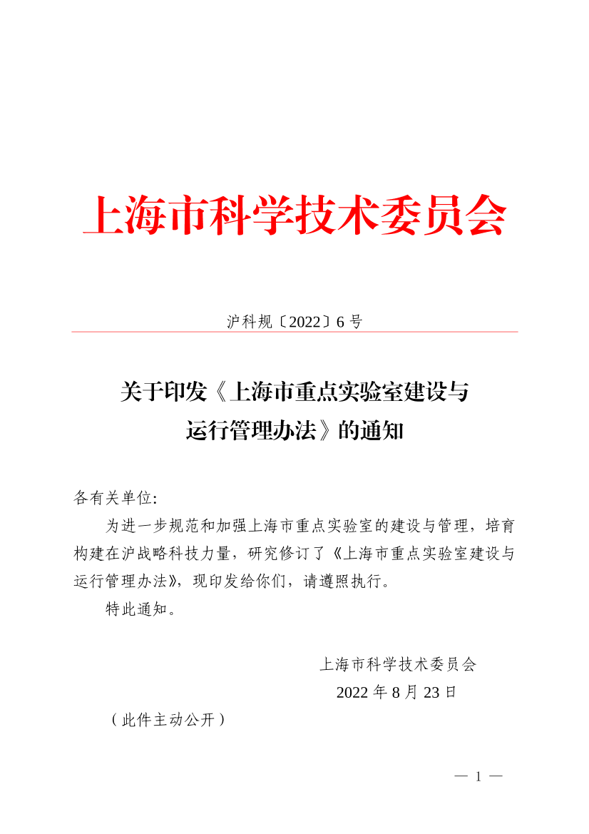 为进一步规范和加强上海市重点实验室的建设与管理,培育构建在沪战略科技力量,研究修订了《上海市重点实验室建设与运行管理办法》,现印发给你们,请遵照执行。