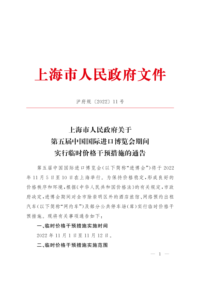 第五届中国国际进口博览会(以下简称“进博会”)将于2022年11月5日至10日在上海举行。为保持价格稳定,形成良好的价格秩序和环境,根据《中华人民共和国价格法》的有关规定,市政府决定,进博会期间对全市除崇明区外的酒店旅馆、网络预约出租汽车(以下简称“网约车”)及部分公共停车场(库)实行临时价格干预措施。现将有关事项通告如下: