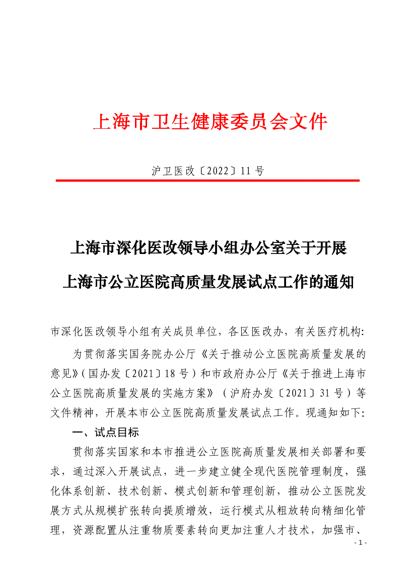 为贯彻落实国务院办公厅《关于推动公立医院高质量发展的意见》(国办发〔2021〕18号)和市政府办公厅《关于推进上海市公立医院高质量发展的实施方案》(沪府办发〔2021〕31号)等文件精神,开展本市公立医院高质量发展试点工作。现通知如下: