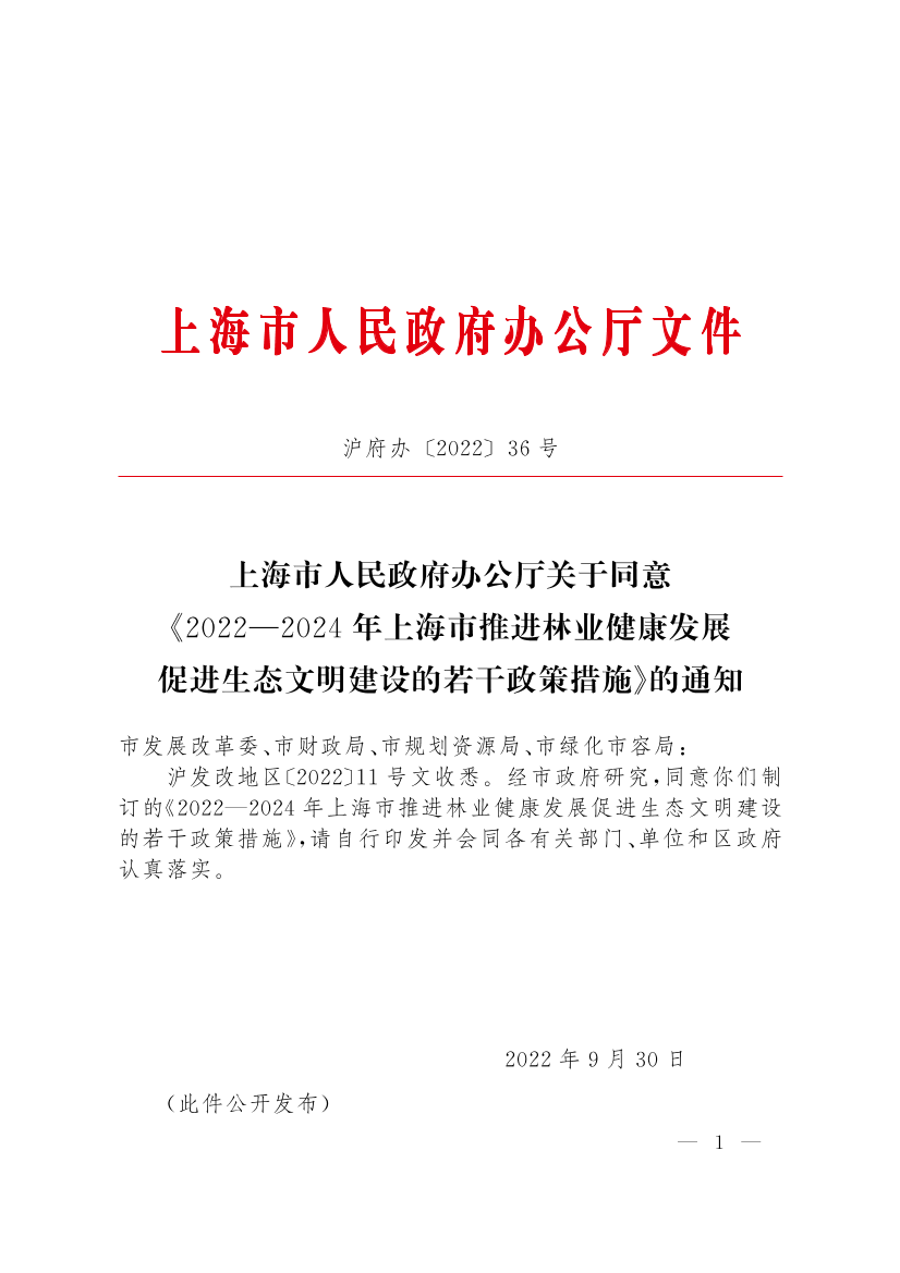 沪发改地区〔2022〕11号文收悉。经市政府研究,同意你们制订的《2022—2024年上海市推进林业健康发展促进生态文明建设的若干政策措施》,请自行印发并会同各有关部门、单位和区政府认真落实。