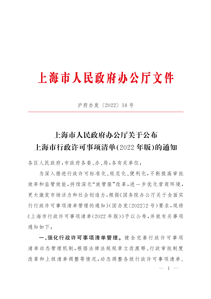 上海市人民政府办公厅关于公布上海市行政许可事项清单(2022年版)的通知