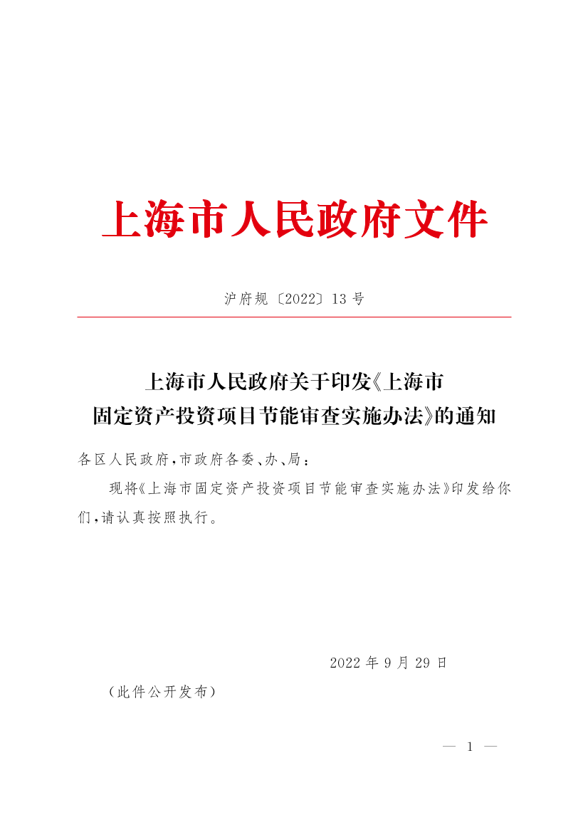 上海市人民政府关于印发《上海市固定资产投资项目节能审查实施办法》的通知
