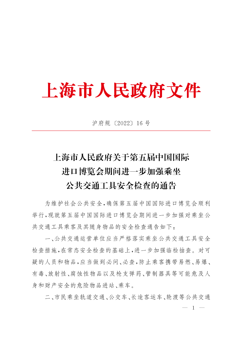 为维护社会公共安全,确保第五届中国国际进口博览会顺利举行,现就第五届中国国际进口博览会期间进一步加强对乘坐公共交通工具乘客及其随身物品的安全检查通告如下: