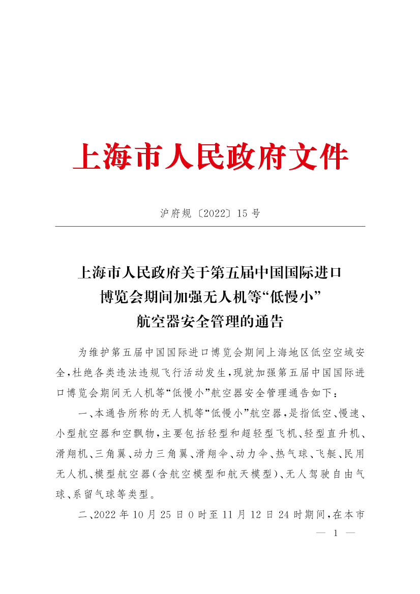 为维护第五届中国国际进口博览会期间上海地区低空空域安全,杜绝各类违法违规飞行活动发生,现就加强第五届中国国际进口博览会期间无人机等“低慢小”航空器安全管理通告如下: