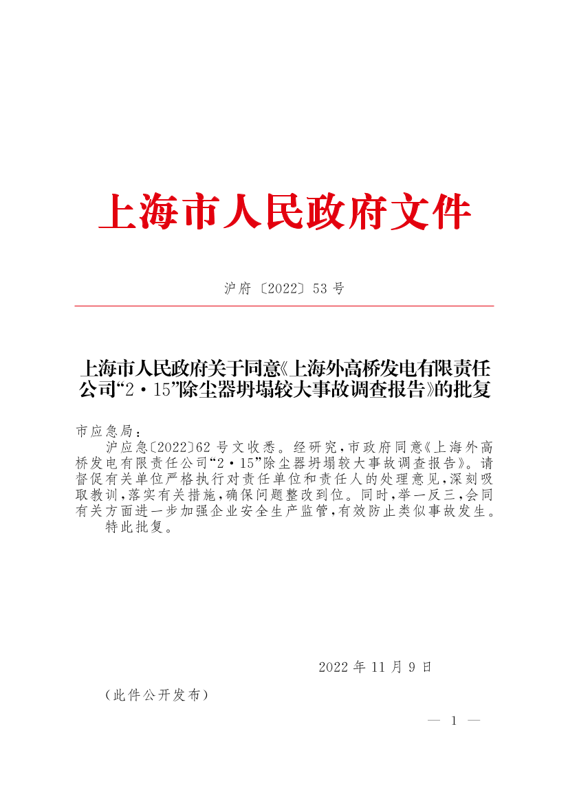 沪应急〔2022〕62号文收悉。经研究,市政府同意《上海外高桥发电有限责任公司“2·15”除尘器坍塌较大事故调查报告》。请督促有关单位严格执行对责任单位和责任人的处理意见,深刻吸取教训,落实有关措施,确保问题整改到位。同时,举一反三,会同有关方面进一步加强企业安全生产监管,有效防止类似事故发生。