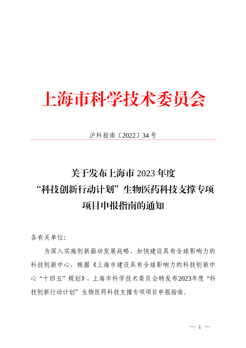 关于发布上海市2023年度“科技创新行动计划”生物医药科技支撑专项项目申报指南的通知