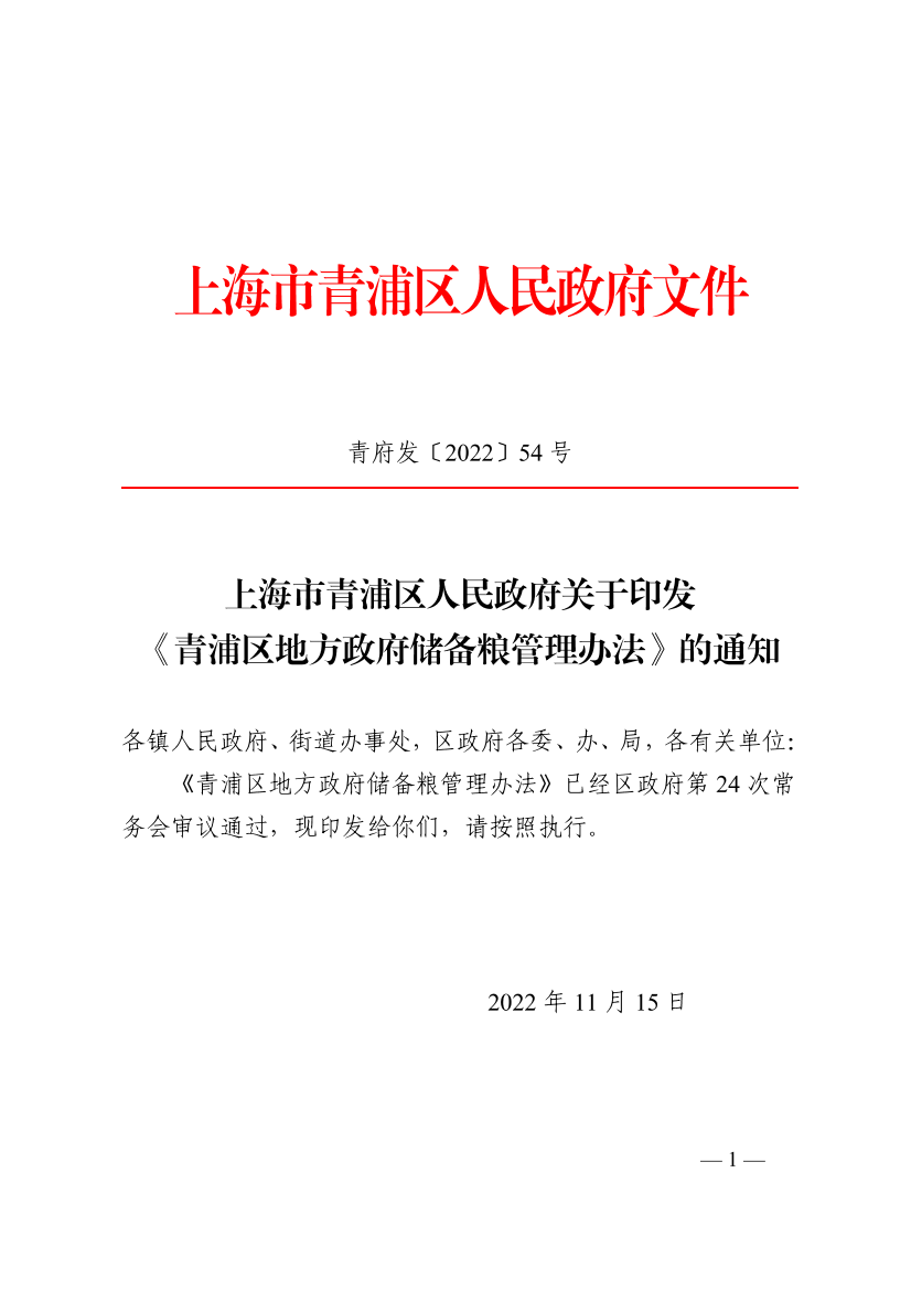 《青浦区地方政府储备粮管理办法》已经区政府第 24 次常务会审议通过,现印发给你们,请按照执行。