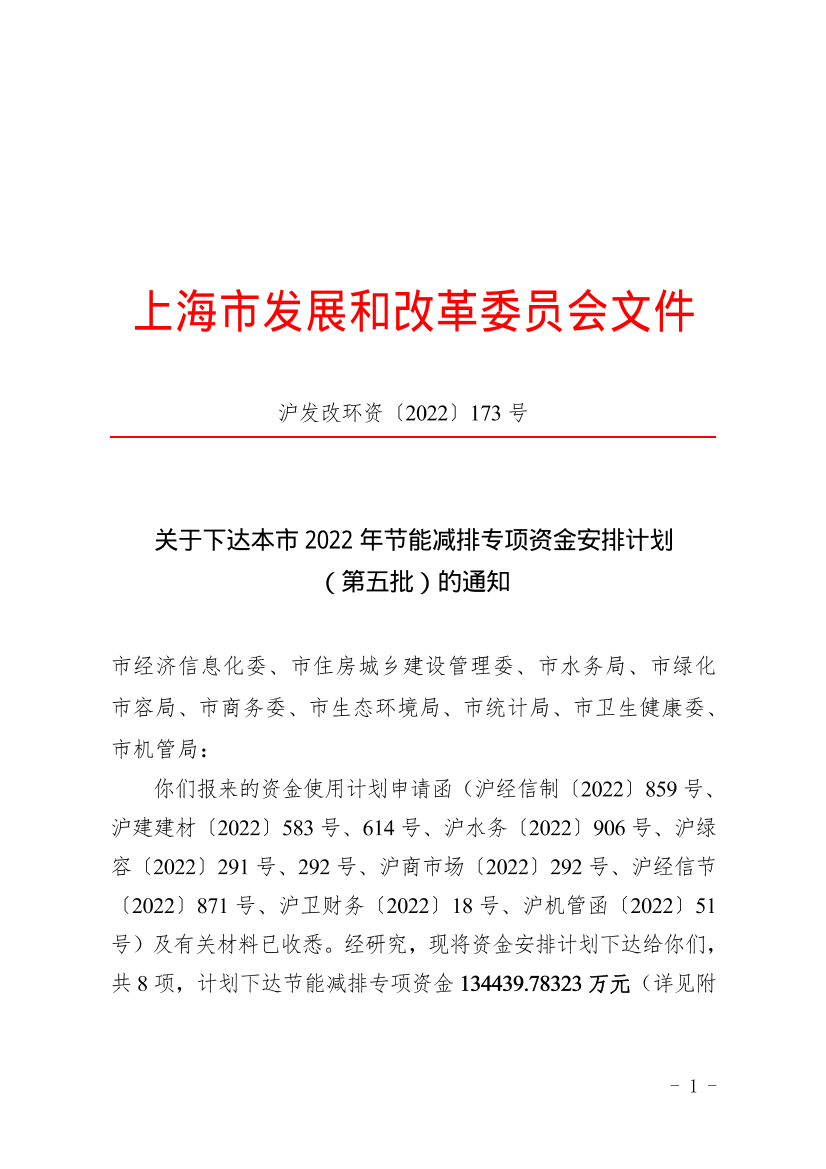 你们报来的资金使用计划申请函(沪经信制〔2022〕859号、沪建建材〔2022〕583号、614号、沪水务〔2022〕906号、沪绿容〔2022〕291号、292号、沪商市场〔2022〕292号、沪经信节〔2022〕871号、沪卫财务〔2022〕18号、沪机管函〔2022〕51号)及有关材料已收悉。经研究,现将资金安排计划下达给你们,共8项,计划下达节能减排专项资金134439.78323万元(详见附表)。有关事项通知如下:
