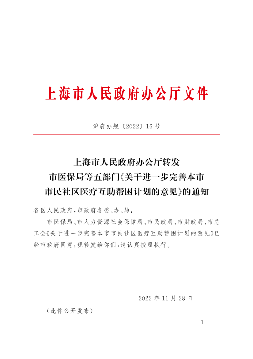 上海市人民政府办公厅转发市医保局等五部门《关于进一步完善本市市民社区医疗互助帮困计划的意见》的通知