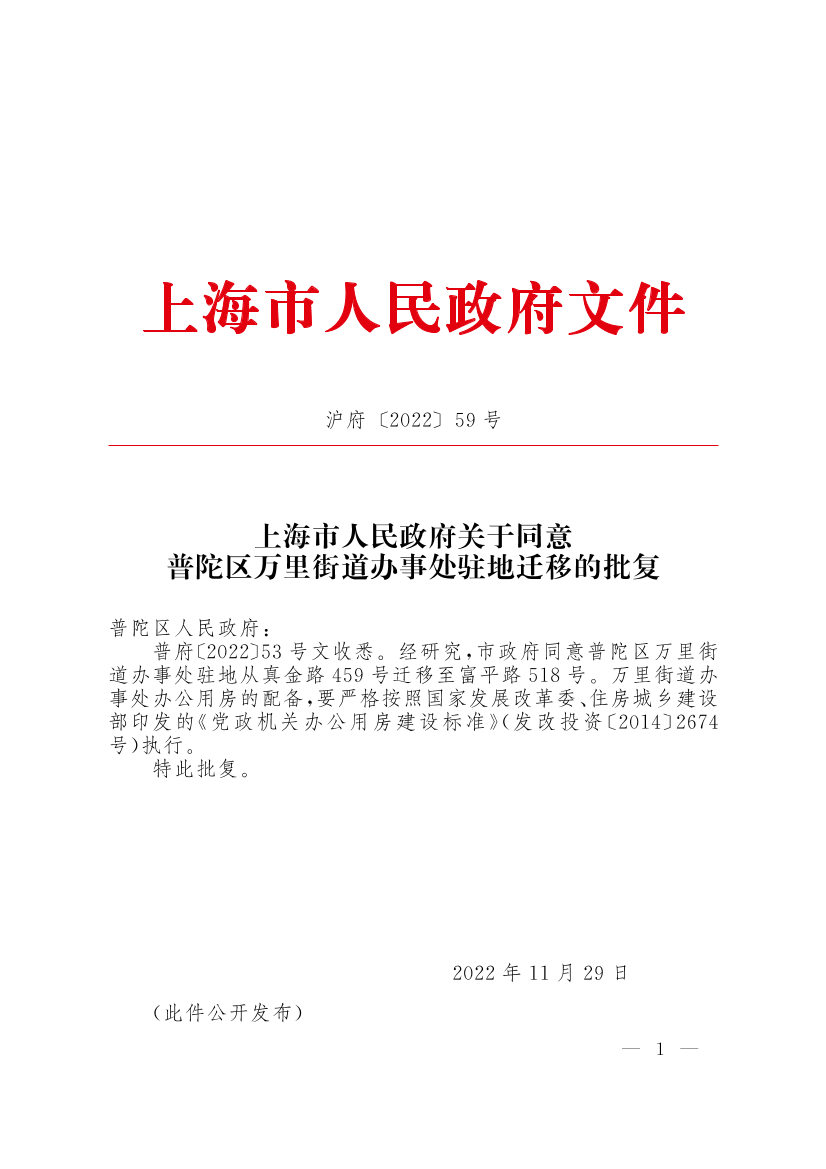 普府〔2022〕53号文收悉。经研究,市政府同意普陀区万里街道办事处驻地从真金路459号迁移至富平路518号。万里街道办事处办公用房的配备,要严格按照国家发展改革委、住房城乡建设部印发的《党政机关办公用房建设标准》(发改投资〔2014〕2674号)执行。