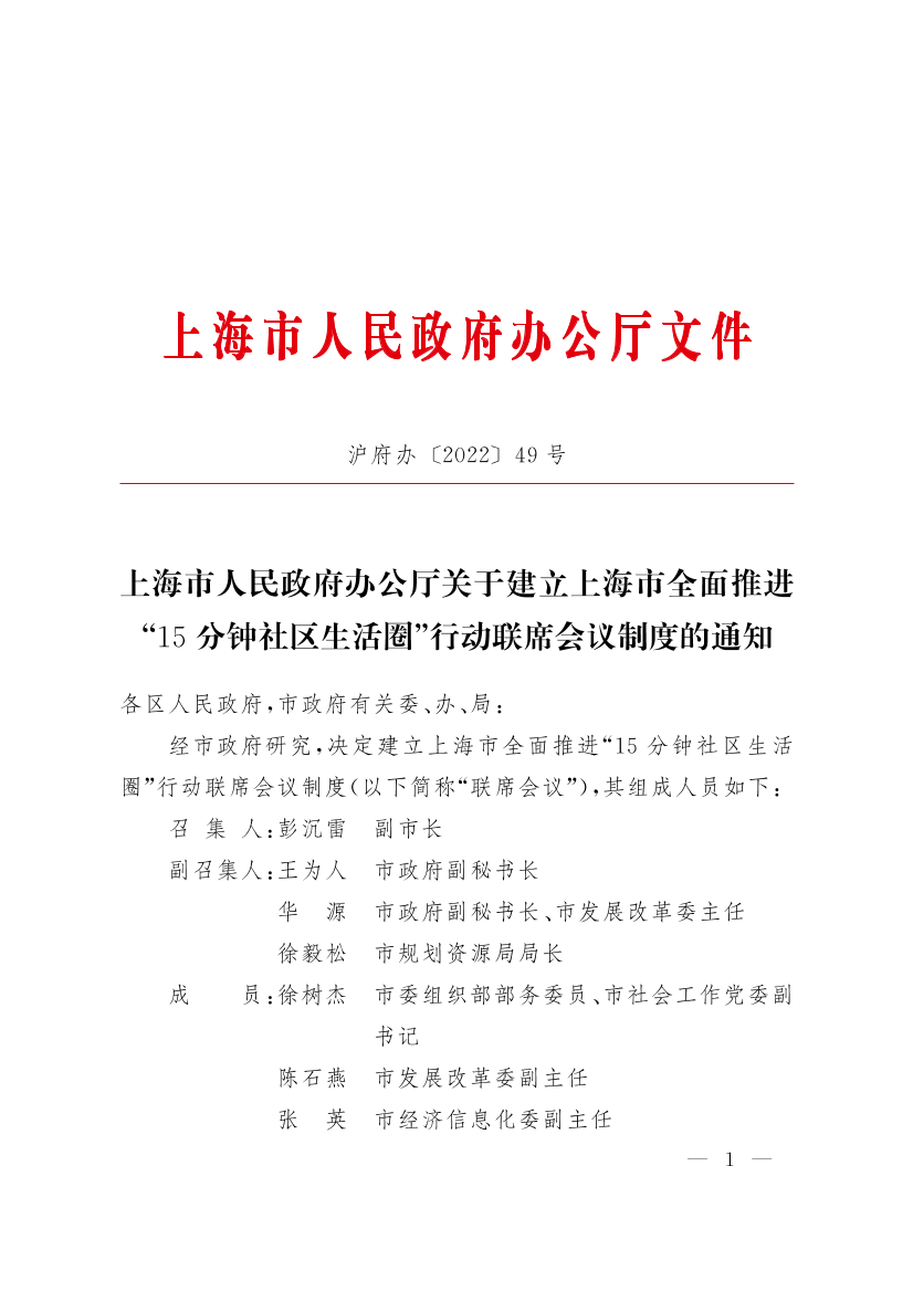 上海市人民政府办公厅关于建立上海市全面推进“15分钟社区生活圈”行动联席会议制度的通知
