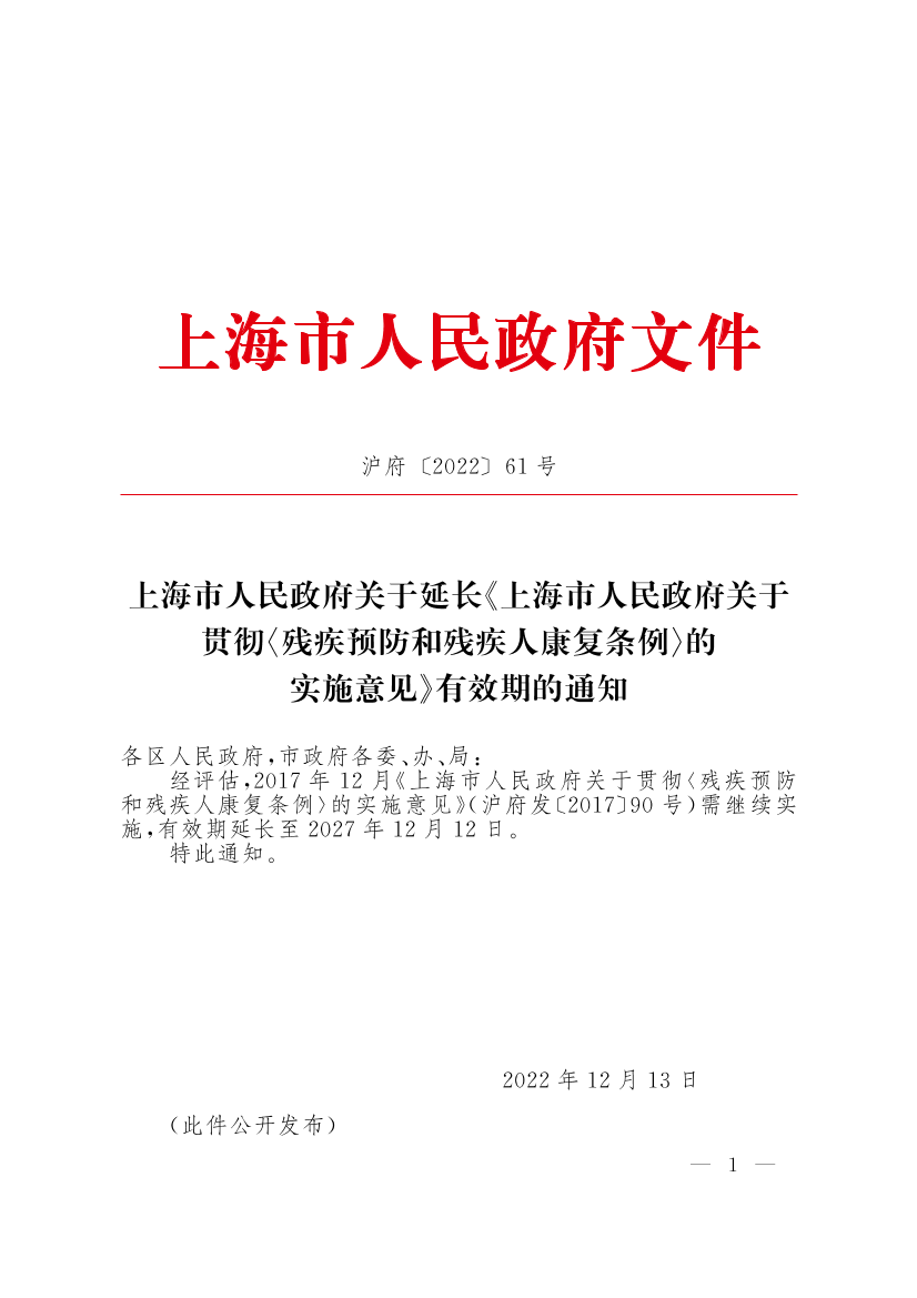 经评估,2017年12月《上海市人民政府关于贯彻〈残疾预防和残疾人康复条例〉的实施意见》(沪府发〔2017〕90号)需继续实施,有效期延长至2027年12月12日。