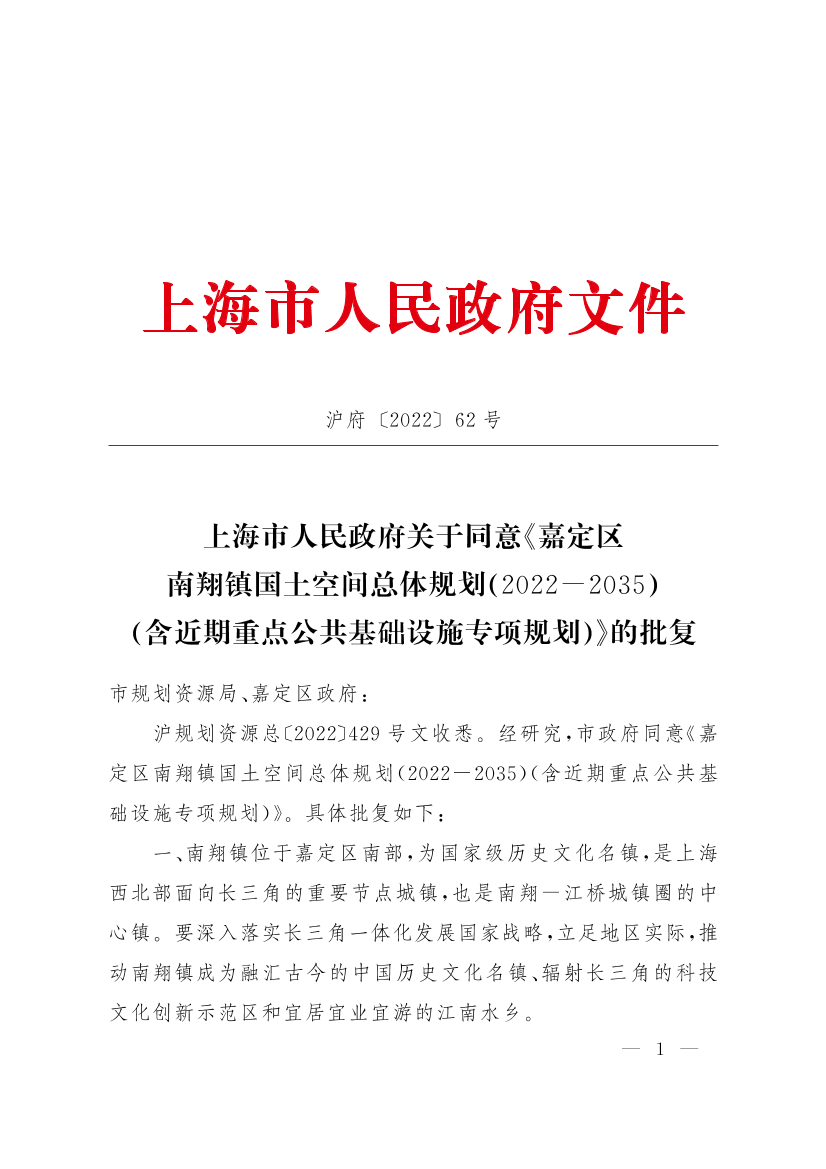 沪规划资源总〔2022〕429号文收悉。经研究,市政府同意《嘉定区南翔镇国土空间总体规划(2022-2035)(含近期重点公共基础设施专项规划)》。具体批复如下: