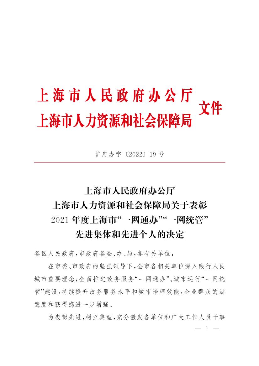 上海市人民政府办公厅、上海市人力资源和社会保障局关于表彰2021年度上海市“一网通办”“一网统管”先进集体和先进个人的决定