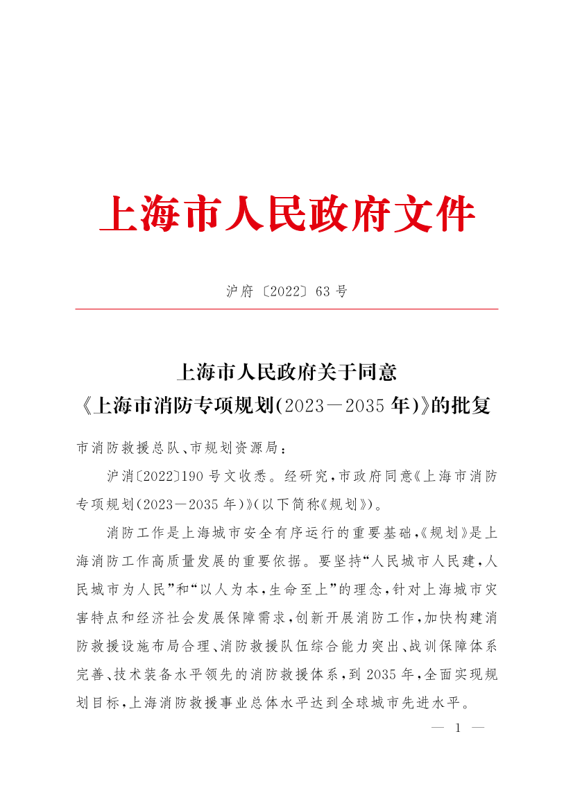 沪消〔2022〕190号文收悉。经研究,市政府同意《上海市消防专项规划(2023-2035年)》(以下简称《规划》)。