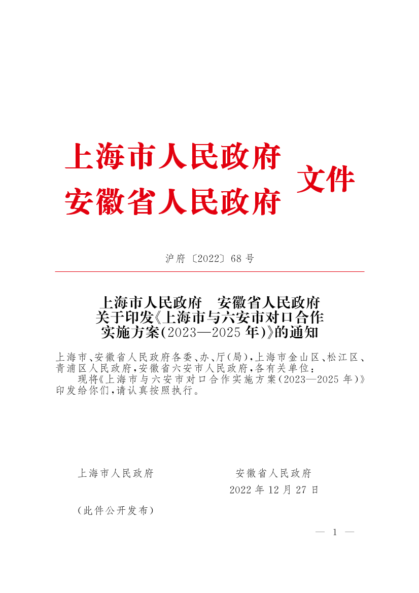 上海市人民政府安徽省人民政府关于印发《上海市与六安市对口合作实施方案(2023—2025年)》的通知